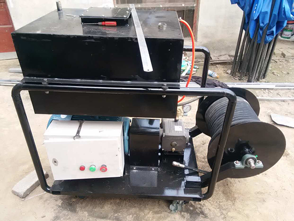 其工作原理為:以汽油機或電動機為動力驅(qū)動高壓泵運轉(zhuǎn),利用高壓水射流在噴頭上產(chǎn)生的推力疏通管道,當(dāng)噴頭到達(dá)管道時,膠管在卷管器拉力(或人力)作用下強制后移,此時高壓水射流來清理管壁并將雜物帶到管外,以達(dá)到清洗管道的目的。